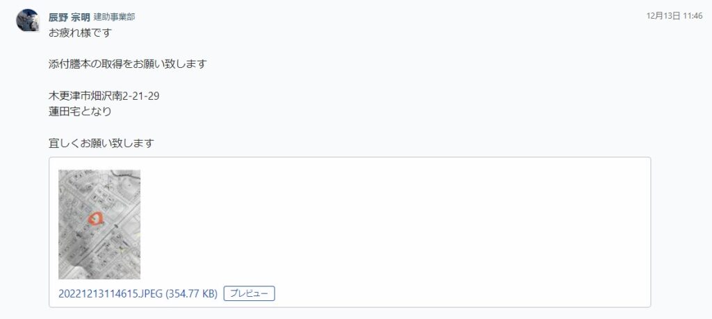 取得希望の土地がわかるように地図にマークの上住所記載してチャットワークに添付する。
