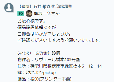 ・ChatWorkグループ:(詰所・設置・撤収依頼・報告)にて設置担当者へ依頼する。